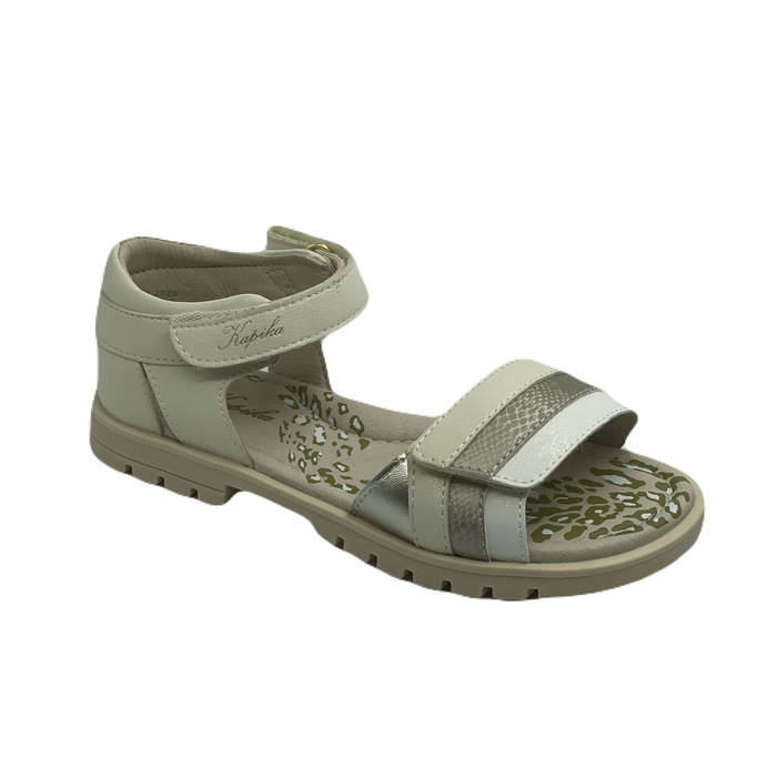 Открытая модель босоножек в светло-бежевых оттенках. Верх изделия выполнен из качественной экокожи. Прочная и гибкая подошва из термоэластопласта. Комфорт в жаркую погоду обеспечивают подкладка и стелька из натуральной кожи.