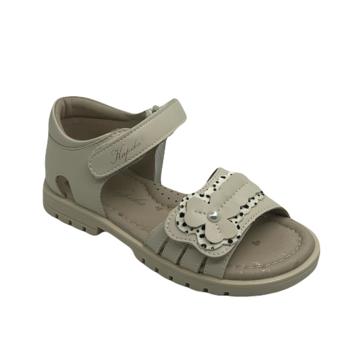 Модель босоножек бежевого цвета с цветочным декором. Открытая носовая часть и высокая закрытая пятка. Верх выполнен из комбинации натуральных и искусственных материалов. Подкладка и стелька из натуральной кожи, что обеспечивает комфорт в жаркую погоду. Прочная и долговечная подошва из термоэластопласта защитит от неровностей поверхности.