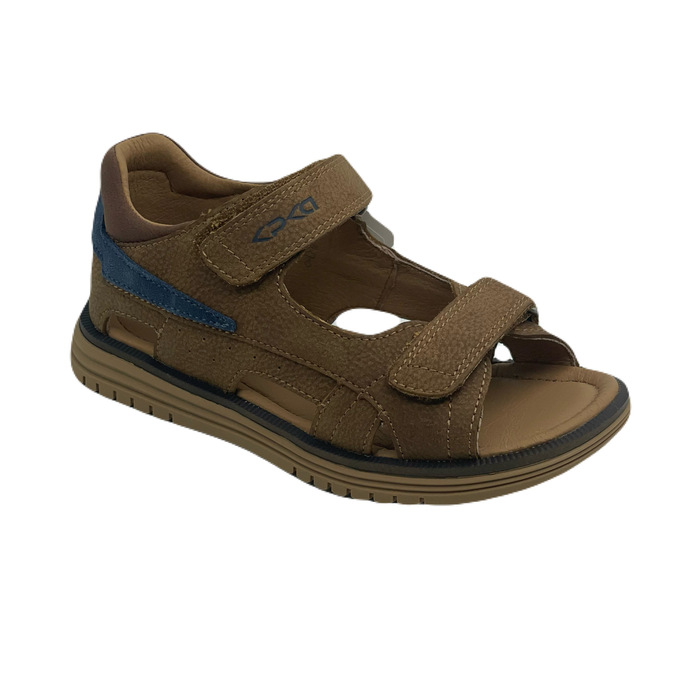 Сандалии коричневого цвета с цветной полоской, с открытой носочной частью и высокой закрытой пяткой. Стелька и подкладка выполнены из натуральной кожи, а верх - из комбинации натуральной и экокожи. Внутри имеется подсводник, который поддерживает продольный свод стопы и обеспечивает правильное положение ноги ребенка при ходьбе. Долговечная подошва из ТЭП продлевает срок службы изделия.