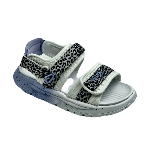 Текстильные сандалии в спортивном стиле с цветовым градиентом на подошве. Декор в виде вставок с анималистичным принтом. Стелька и подошва выполнены из материала ЭВА, что обеспечивает легкость, упругость, а также хорошую амортизацию при ходьбе.