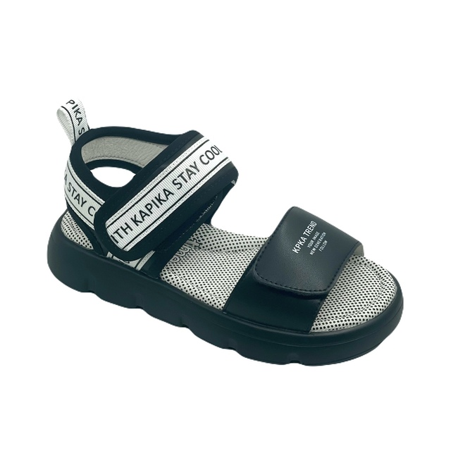 Открытые черные сандалии с текстовым принтом. Верх изделия выполнен из качественной экокожи. Подкладка и стелька выполнены из натуральной кожи, что обеспечивает комфорт в жаркую погоду. Комбинированная подошва из материалов ЭВА и резина обеспечивает легкость, прекрасную амортизацию и износостойкость.