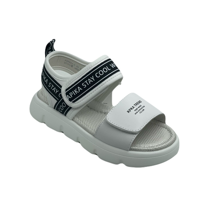 Открытые белые сандалии с текстовым принтом. Верх изделия выполнен из качественной экокожи. Подкладка и стелька выполнены из натуральной кожи, что обеспечивает комфорт в жаркую погоду. Комбинированная подошва из материалов ЭВА и резина обеспечивает легкость, прекрасную амортизацию и износостойкость.